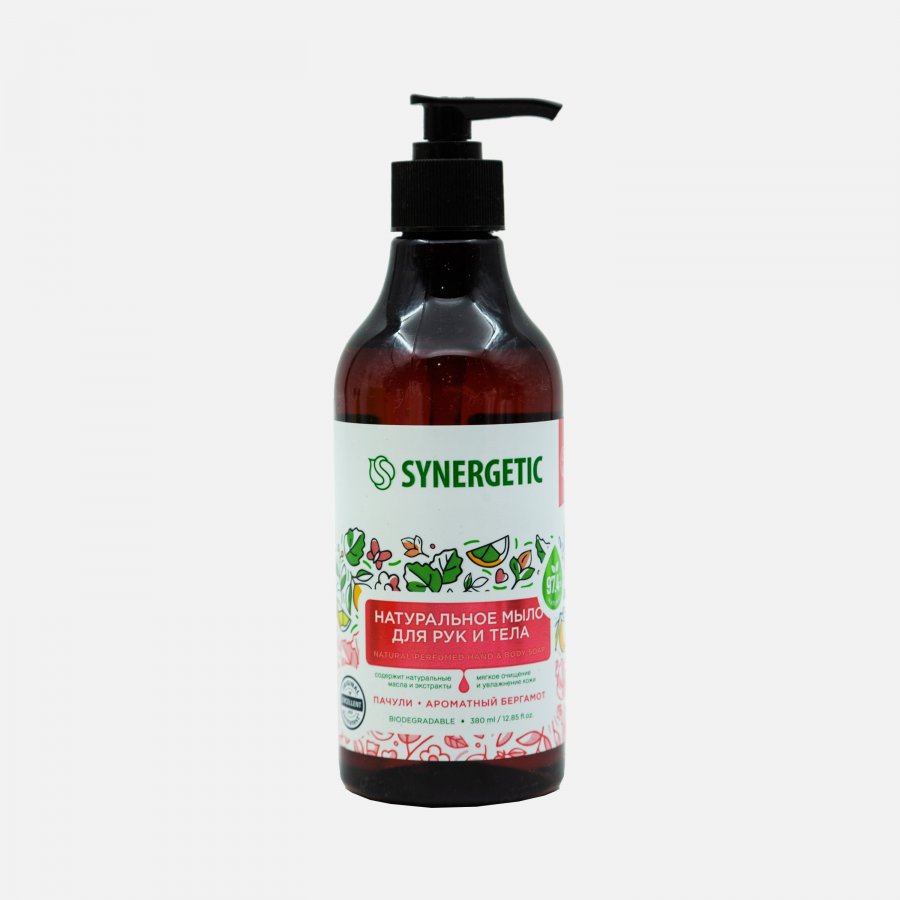 Мыло жидкое СИНЕРГЕТИК Пачули и ароматный бергамот 380мл с дозатором